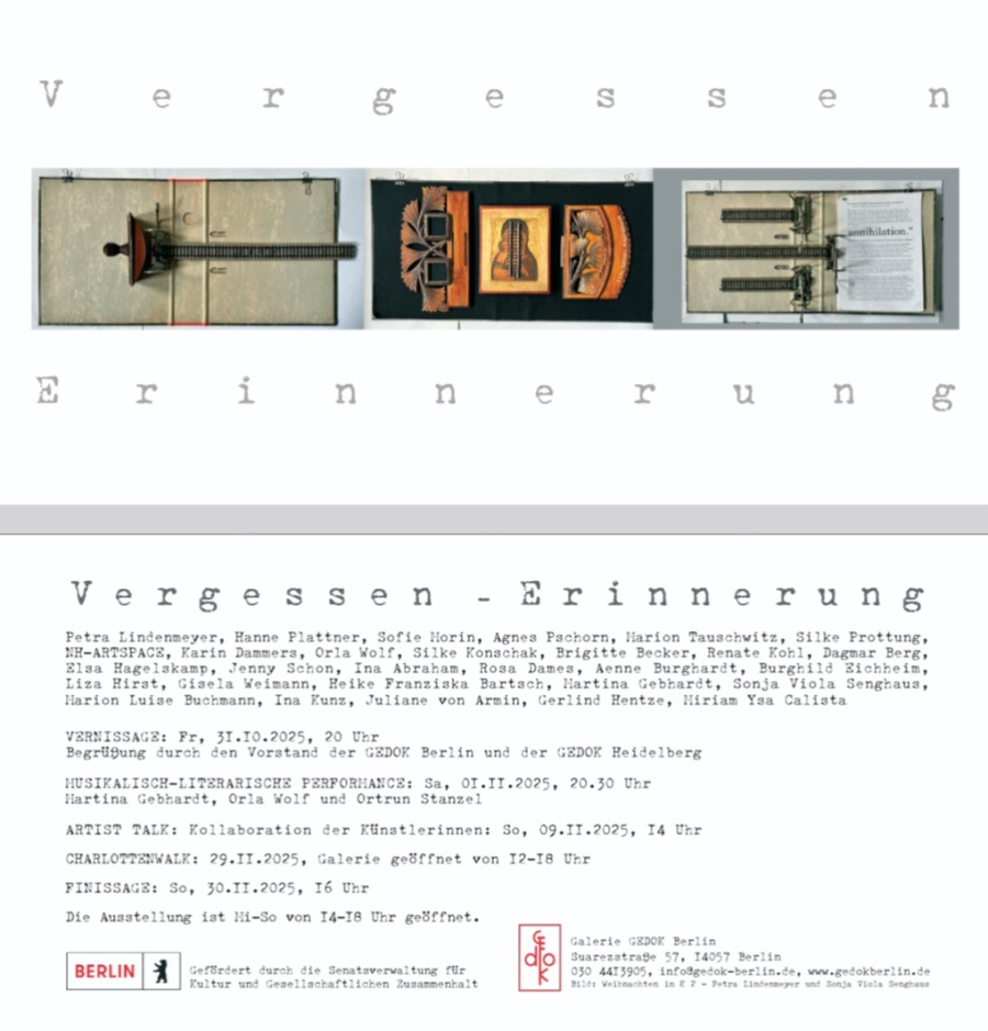 Ich nehme mit der interdisziplinären Arbeit IDA DEHMEL - LEBENSSTÜCKE (VISUELL & AUDITIV), die in Kollaboration mit den Berliner Künstlerinnen Silke Konschak und Karin Dammers und der Heidelberger Musikerin Brigitte Becker entstanden ist, an der Ausstelllung VERGESSEN - ERINNERUNG teil.